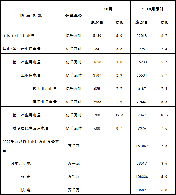 1-10月份,全國全社會(huì)用電量52018億千瓦時(shí),同比增長(zhǎng)6.7%。10月份,全國全社會(huì)用電量5130億千瓦時(shí),同比增長(zhǎng)5.0%。