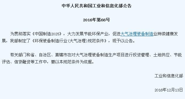 為貫徹落實《中國制造2025》,大力發(fā)展節(jié)能環(huán)保產(chǎn)業(yè),規(guī)范行業(yè)秩序,引導(dǎo)大氣治理裝備制造行業(yè)持續(xù)健康發(fā)展,工信部制定了《環(huán)保裝備制造行業(yè)大氣治理規(guī)范條件》條例。