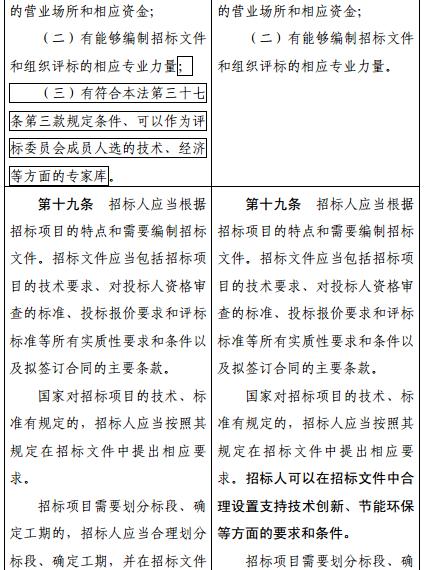 在對(duì)招標(biāo)法第19條的修改中,在保留原有“國(guó)家對(duì)招標(biāo)項(xiàng)目的技術(shù)、標(biāo)準(zhǔn)有規(guī)定的,招標(biāo)人應(yīng)當(dāng)按照其規(guī)定在招標(biāo)文件中提出相應(yīng)要求”內(nèi)容的基礎(chǔ)上,增加了“招標(biāo)人可以在招標(biāo)文件中合理設(shè)置支持技術(shù)創(chuàng)新、節(jié)能環(huán)保等方面的要求和條件”的內(nèi)容,加重了創(chuàng)新和節(jié)能環(huán)保在招投標(biāo)中的考量力度。