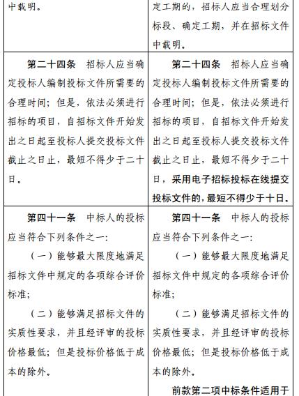 五、將第二十四條修改為:“招標(biāo)人應(yīng)當(dāng)確定投標(biāo)人編制投標(biāo)文件所需要的合理時(shí)間;但是,依法必須進(jìn)行招標(biāo)的項(xiàng)目,自招標(biāo)文件開始發(fā)出之日起至投標(biāo)人提交投標(biāo)文件截止之日止,最短不得少于二十日,采用電子招標(biāo)投標(biāo)在線提交投標(biāo)文件的,最短不得少于十日。”