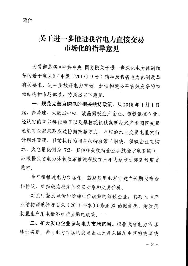 四川省經(jīng)信委、四川省發(fā) 改委、國(guó)家能源局四川監(jiān)管辦、四川省能源局日前聯(lián)合下發(fā)了《關(guān)于進(jìn)一步推進(jìn)我省電力直接交易市場(chǎng)化的指導(dǎo)意見》(以下簡(jiǎn)稱“意見”)。意見中稱,將規(guī)范完善直購(gòu)電的相關(guān)扶持政策,擴(kuò)大發(fā)電企業(yè)參與電力市場(chǎng)范圍,全面放開售電公司參與電力市場(chǎng),穩(wěn)步推進(jìn)進(jìn)商業(yè)用戶進(jìn)入電力市場(chǎng),積極開展產(chǎn)業(yè)園區(qū)直接交易試點(diǎn),穩(wěn)妥開展跨省跨區(qū)富余可再生能源電力現(xiàn)貨交易試點(diǎn),放開地方電網(wǎng)(躉售區(qū))進(jìn)入直接交易市場(chǎng),有序推進(jìn)其他特殊行業(yè)企業(yè)完全電力市場(chǎng)化。詳情如下: