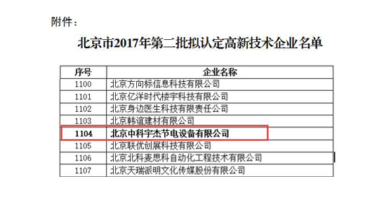 近日,國(guó)家高新技術(shù)企業(yè)認(rèn)定管理工作網(wǎng)發(fā)布了《關(guān)于公示豐臺(tái)園2017年第二批擬認(rèn)定高新技術(shù)企業(yè)名單的通知》,北京中科宇杰節(jié)電設(shè)備有限公司通過認(rèn)證,榮獲“國(guó)家高新技術(shù)企業(yè)”的殊榮。
