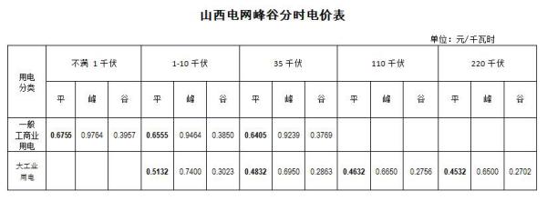 山西電網(wǎng)峰谷分時(shí)電價(jià)表