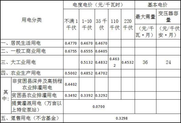 注:1、上表所列價(jià)格,除貧困縣農(nóng)業(yè)排灌用電、躉售用電外,均含國(guó)家重大水利工程建設(shè)基金0.7分錢。