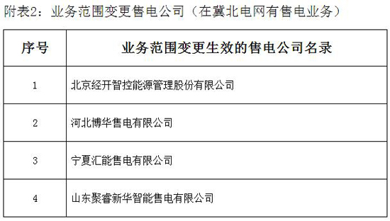 冀北電力交易中心有限公司于2017年10月19日至2017年11月19日共對13家售電公司進行了公示,具體為:北京電力交易中心受理并在冀北電網(wǎng)有售電業(yè)務(wù)的龍源電力集團能源銷售有限公司等9家售電公司;北京電力交易中心推送業(yè)務(wù)范圍變更至冀北的北京經(jīng)開智控能源管理股份有限公司等4家售電公司。
