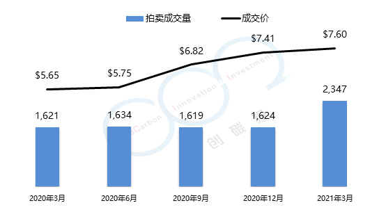 RGGI碳市場的初始配額發(fā)放以拍賣為主,每個季度舉行一次拍賣。2021年第一季度拍賣成交均價為$7.60美元,較上一季度漲幅為2.5%。由于弗吉尼亞州的加入,RGGI總成交量創(chuàng)歷史新高,達(dá)到了2347萬噸。以下是由中創(chuàng)碳投統(tǒng)計(jì)的RGGI近一年的交易情況。