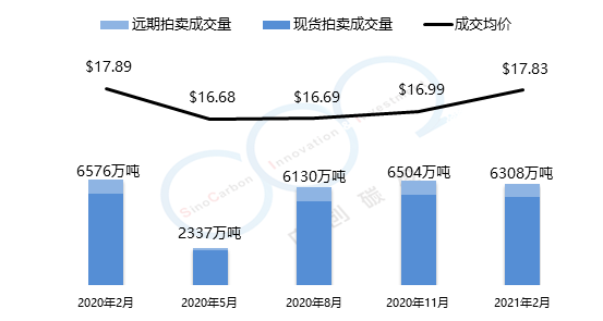 加州-魁北克碳市場的初始配額發(fā)放以拍賣為主,每個季度舉行一次拍賣。2021年2月拍賣均價為17.83美元,較上一季度漲幅為5%,總成交量為6308萬噸。以下是由中創(chuàng)碳投統(tǒng)計(jì)的加州-魁北克碳市場近一年的交易情況。