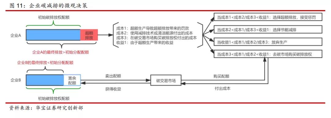 按照華寶證券的分析,有效碳市場的碳排放權的價格就是企業(yè)的邊際減排成本。在企業(yè)微觀決策上,主要是將碳減排成本、超額碳排放成本、購買碳配額的成本與超額排放生產帶來的收益進行比較,并作出相應決策。