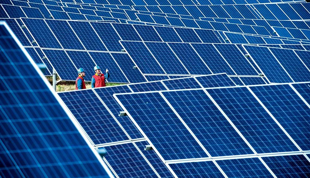 ▲ 4月28日,國網(wǎng)山東淄博供電公司技術(shù)人員巡檢光伏電站。遠(yuǎn)德亮攝
