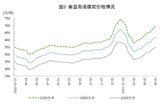 ? ? ? 港口煤炭綜合交易價(jià)格持續(xù)上漲。4月30日,秦皇島港5500、5000和4500大卡煤炭?jī)r(jià)格分別為每噸690元、618元、549元,比4月2日分別上漲56元、51元和47元。