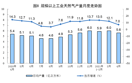 ? ?天然氣生產(chǎn)保持穩(wěn)定增長(zhǎng)。4月份,生產(chǎn)天然氣169億立方米,同比增長(zhǎng)7.0%,比2019年4月份增長(zhǎng)22.3%,兩年平均增長(zhǎng)10.6%,日產(chǎn)5.6億立方米。