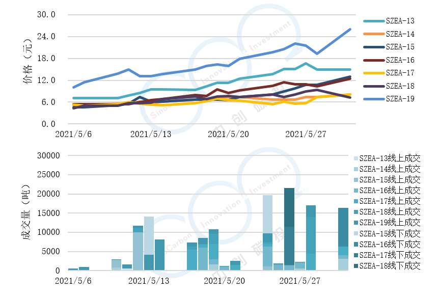• 線上成交價(jià)最低為4.39(產(chǎn)品SZEA-18),最高為25.99元(產(chǎn)品SZEA-19),平均碳價(jià)為10.08元(平均碳價(jià)為各產(chǎn)品價(jià)格加權(quán)得出)。
