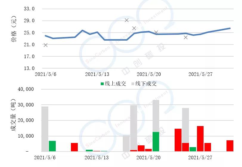 • 線上成交價(jià)最低為22.60元,最高為26.50元,平均碳價(jià)為24.47元。