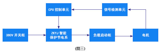 由圖三所示,在低壓380V開關(guān)柜與負(fù)載(風(fēng)機(jī)水泵、空壓機(jī)、及電機(jī)拖動(dòng)類)啟動(dòng)柜之間串接智能保護(hù)節(jié)電系統(tǒng),系統(tǒng)在電機(jī)的使用上,它能自動(dòng)跟蹤檢測(cè)電機(jī)運(yùn)行中的負(fù)載變化,將檢測(cè)信號(hào)反饋給控制中心,經(jīng)過(guò)中央處理,運(yùn)算放大后給出指令信號(hào),以此來(lái)改變有功電量的輸出,使電機(jī)在最經(jīng)濟(jì)的電耗下運(yùn)行,達(dá)到節(jié)電的目的。