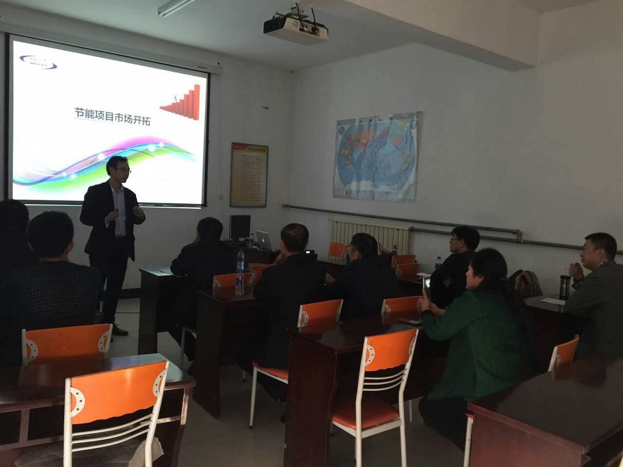 中科宇杰董事長郝澤忠先生也是做好了充分的準備,積極解答了代理商們在項目實施過程中存在的問題,并提出具體有效的解決方案,并在培訓會場中為大家詳細分析了目前我國節(jié)能項目市場前景,分享了節(jié)能項目市場開拓的經驗。